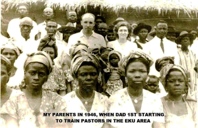 Amazing, it seamed like Everyone was coming to help build the Eku Hospital, so Mother thought that along with helping at the clinic, she wanted to start a Woman’s Mission Union, so there would be Strong Pastor’s wives & even Stronger Christian Leaders in the area – She also decided to gather some of the Pastor’s Wives and to have Fun – She held a “Baby Contest” & these are the finalists – But the handsome boy on the far-Right with the smiling Mom, Won !!! – Each day my Dad would meet with Mr. Atigari, to make sure his Blueprints were being followed in Building the Hospital — Plus he and Rev. Aganbi would Open the Clinic each morning, with Prayer as Chaplains to share the precious Love of Jesus for the Eku people! Rev. Aganbi’s Motto was: “Service to God and Man”! As they greeted and prayed for different ones, everyone would see Rev. Aganbi also going around teaching everyone to always pick up their trash & keep things clean – He Knew that would help to keep flies & diseases out (Wish we all remembered that today) – He even went to school to have all the students each day, make sure they keep the compound clean – in 1946, at a certain time each day, Dad started Training more Pastors to start churches all over the area – They were very strong Partners, working side by side as: “One heart, one mind for the contending of the Gospel” – Both were unbelievable “Workaholics” – Tireless workers for Others & on Fire for Jesus & full of God’s Zeal !!! – Jesu Kobiru ooo !!! (next time you will see some of the Hospital buildings being built – yaa) na Omoteko – Wa dooo !!
